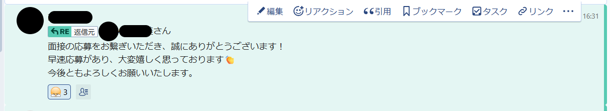別で法人採用HPから直接応募があった26新卒の方も**をご覧になって応募してくださいました!さすが反響がすごいです!ありがとうございます!